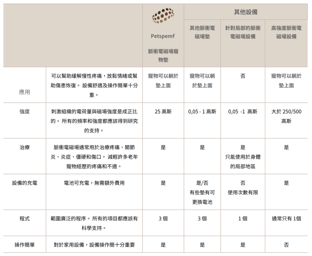 Petspemf 寵物保健墊與其他設備比較